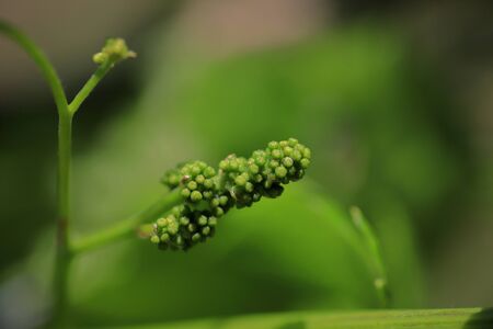 Vine sprout with young bunch of grapes. Close up of young clusters of grapes. Lots of copy space for text.