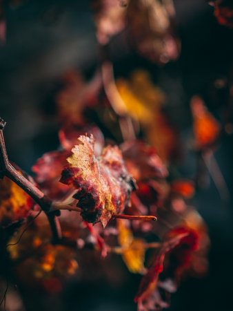 Close-up of ripe red grapes growing on vine in sunny vineyard, ready for harvest