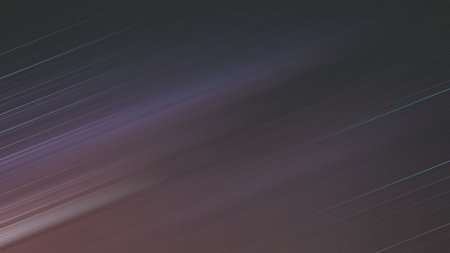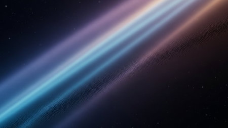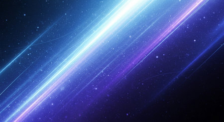 Diagonal streaks of soft purple, blue, and orange light with glowing particles in dark space.