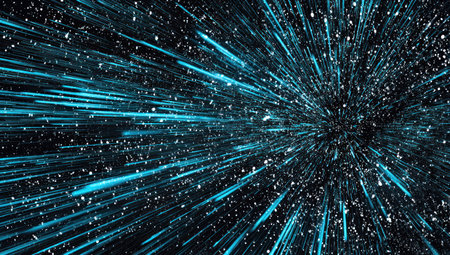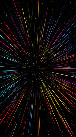 Explore an abstract cosmic journey filled with vibrant light beams and shimmering particles, evoking a sense of speed and infinite possibilities in dark space.