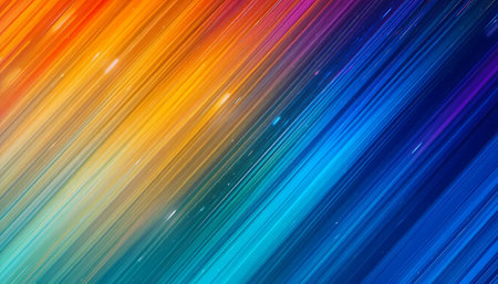 Abstract background with diagonal streaks of vibrant orange, yellow, teal, blue and purple. Sparkling texture throughout