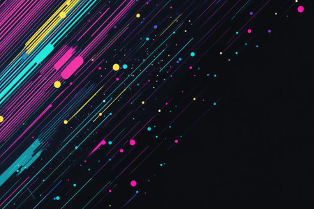A black background with colorful lines and dots in the center, representing sound waves or data points. The colors include purple, blue, pink, and green, creating an abstract digital landscape. There is space for text on one side of the design. This concept symbolizes technology, modernity, music production, advertising, marketing, web development, AI, and other creative design elements. It can be used as a banner, poster, presentation background, social media post, or cover art. --ar 3:2 --v 6.1 Job ID: 54a438ea-dba4-4b84-b955-5f77294242a3