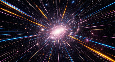 Vibrant colorful light streaks burst outwards from a central glowing point against a dark background.