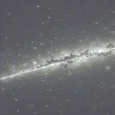 The luminous core of a galaxy with a bright light streak cutting through a dense field of stars and cosmic dust in a monochrome tone.