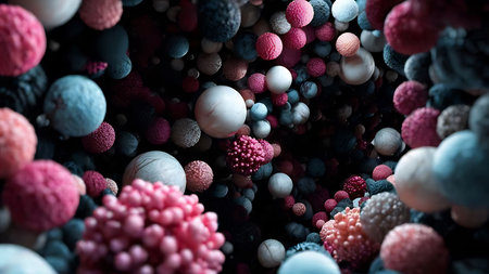 A close-up, abstract view of numerous spherical, textured particles resembling microscopic organisms or pollen, rendered in various vibrant colors against a dark background.