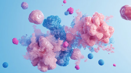 Creative rendering of cellular biology with floating abstract shapes representing organelles. Copy space.