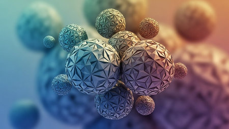 A detailed macro view of a shimmering molecular structure composed of interconnected spheres in shades of pink, blue, and purple, suggesting a scientific or...