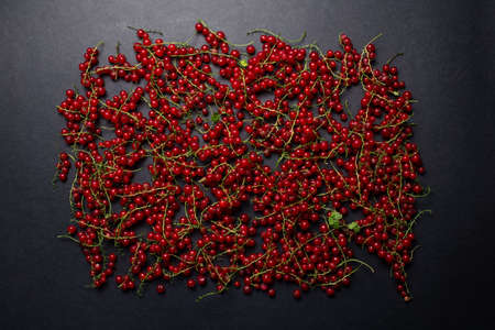 Studio picture of red currants spread out on a dark background.