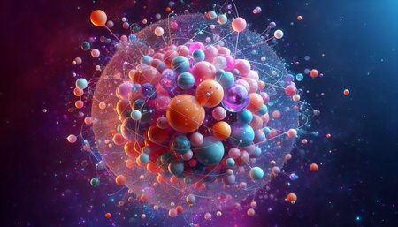 This vivid abstract illustration showcases colorful molecular structures, creating a dynamic and artistic representation perfect for science and technology themes.