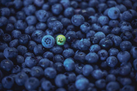 Wet fresh Blueberries, one of a hundred, one blueberry did not ripen