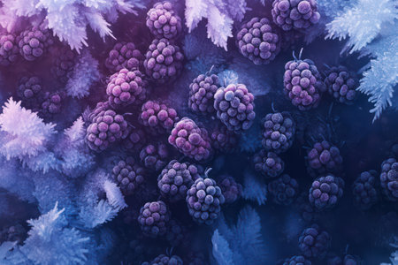 Ultra-detailed close-up of whole blackberries covered in frost, creating a textured and cinematic icy fruit surface.