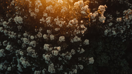 A breathtaking view of white flowers in full bloom illuminated by soft golden sunset light, creating a tranquil and serene atmosphere in a natural setting.