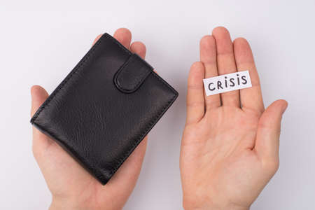 the inscription crisis on a small white piece of paper sticks out of the pocket of the wallet, white background, copy space