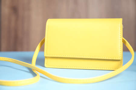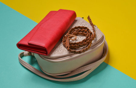 Female trend accessories on a blue pastel yellow background. Leather bag, red purse, braided belt.