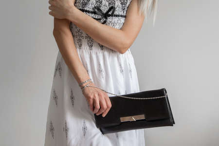 Front crop view of young fashionable woman dressed with long dress and holds a hand bag