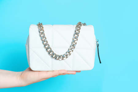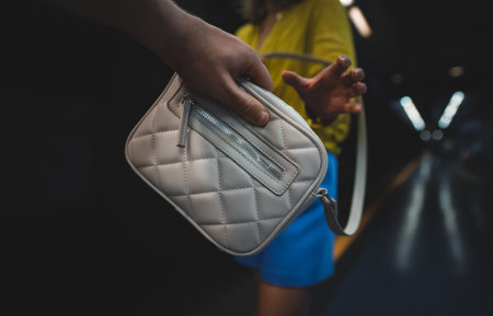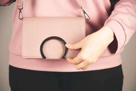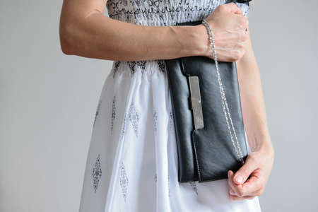 Fashion elegant evening outfit. Close up female hand holding black rivet leather handbag bag
