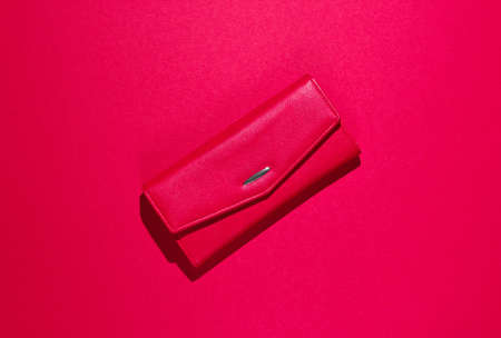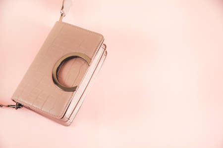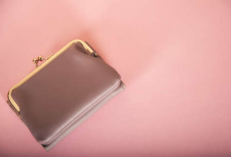 Female wine-colored wallet on pastel pink background. Flat lay. Copy space.
