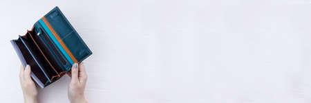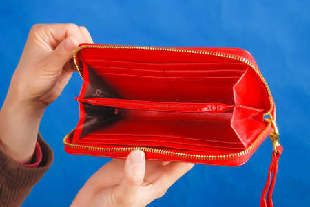 Close-up of blue empty wallet in hand due to the effects of unemployment.