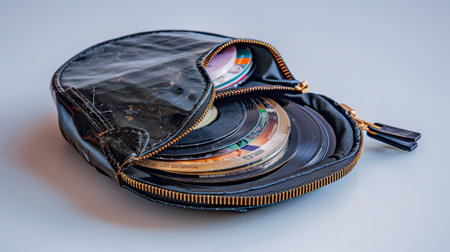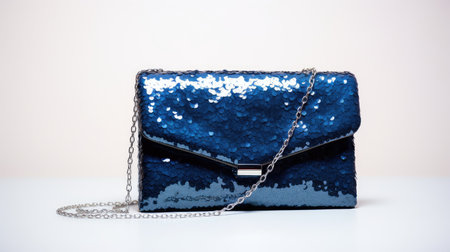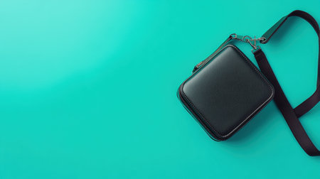 A sleek black purse sits against a bright turquoise backdrop, highlighting its modern design and elegance. Ideal for fashion and accessory themes.
