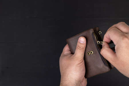 No money no job concept. Pov Cropped close up overhead top view photo of male hands showing closed wallet and word crisis lying on palm isolated over grey background