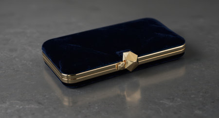 Velvet clutch purse with gold metal trim and geometric clasp placed on a dark textured surface, conveying luxury and tactile materials for fashion editorials, product listings and lifestyle presentations