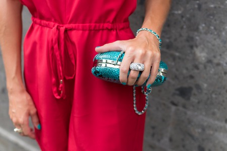 Fashionable woman in red dress holding leather snakeskin python bag. Elegant outfit. Close up of purse in hands of stylish lady. Model posing near the swimming pool.