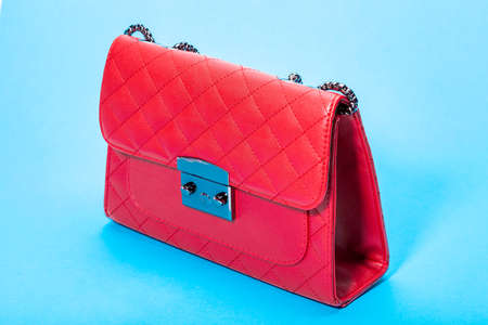 woman`s handbag in red leather with square pattern, side view object on a blue background.