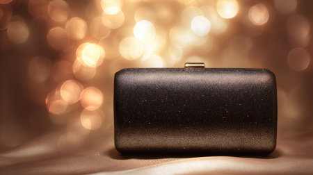A beautifully styled black clutch purse rests on soft silk fabric, complemented by a shimmering bokeh background, perfect for fashion-focused projects.