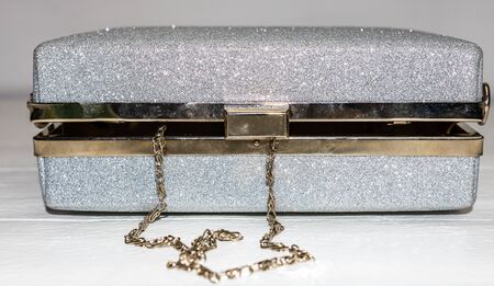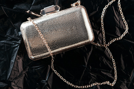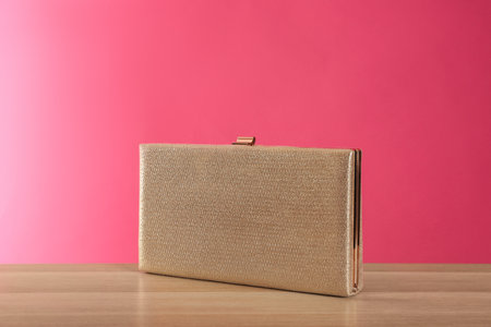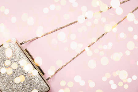 Festive evening golden clutch on pink. Holiday and celebration background. Luxury accessories and party concept. Horizontal, bold light bokeh background