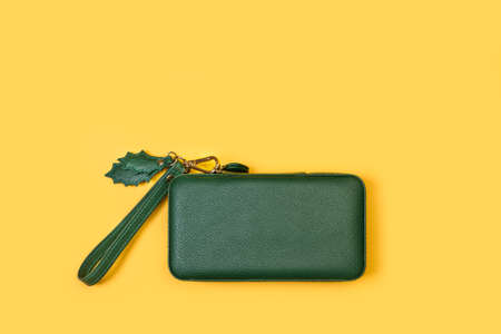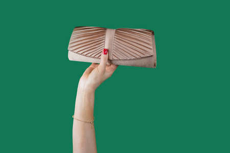 the girl holds in her hand a stylish modern golden clutch in her hand on a green background