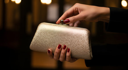 A close-up of a woman's hands with perfectly manicured red nails, holding an elegant, gold glitter clutch purse. The background is dark with blurred bokeh lights, suggesting an evening event, party, or formal occasion.