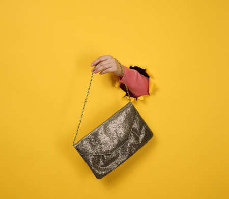 female hand is holding a small golden clutch bag with a metal chain on a yellow background. Part of the body sticking out of a torn hole in a paper background