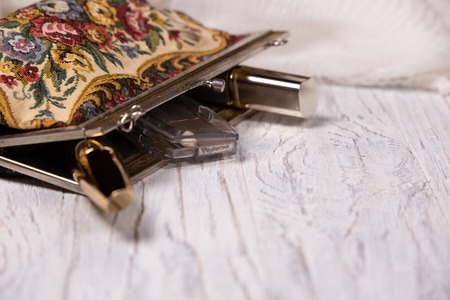 woman in a purple satin dress and a bracelet decoration on her hand holds a clutch handbag on a green natural backgrounds a black compact clutch handbag.