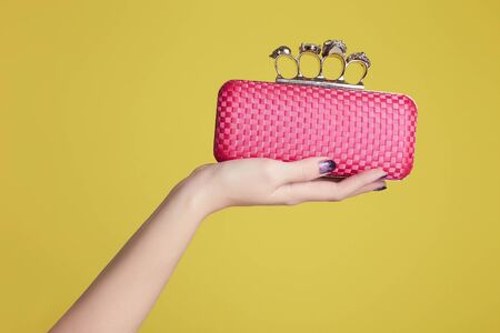 Female hand holding a red wallet through torn yellow paper. Minimalistic creative fashion concept