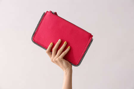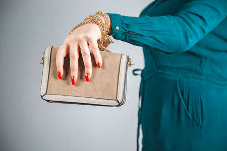 Beautiful hand with red manicured nails holding gold purse handbag on gray background.