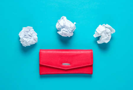 Minimal concept. Crumpled paper balls, red leather wallet on blue background