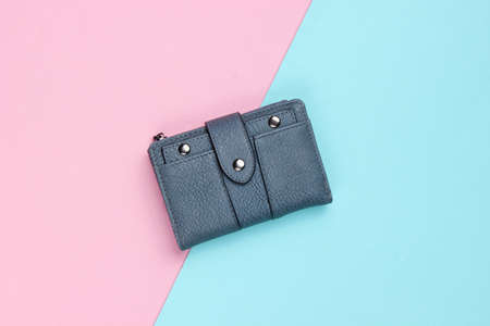 Fashionable leather wallet on a blue-pink pastel background. Top view