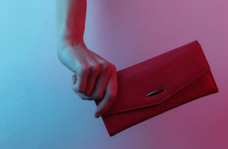 Female hand holds a leather wallet. Creative pop art pink blue neon color. Trendy gradient illumination. Night light