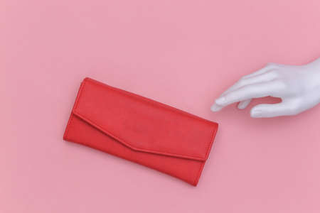 The mannequin's white hand touches a red leather wallet on a pink background. top view
