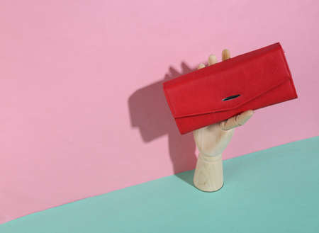 Wooden hand holding red wallet on blue pink pastel background. trendy shadow. concept art. minimalism. creative layout