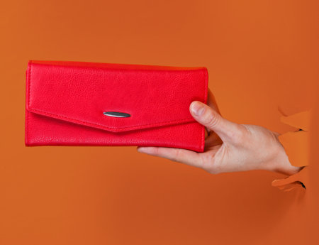 Female hand holding a red wallet through torn orange paper. Minimalistic creative fashion concept