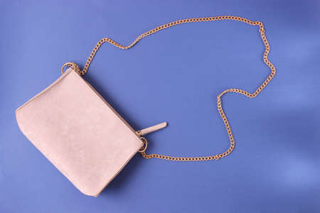 Festive evening golden clutch on pink. Holiday and celebration background. Luxury accessories and party concept. Horizontal. Ultra violet tone, color of the year 2018