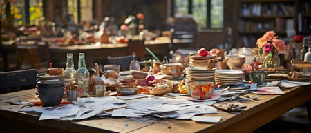A photo capturing a table covered in various objects and papers amidst a disorganized and cluttered room, A chaotic kitchen table full of work materials, AI Generated