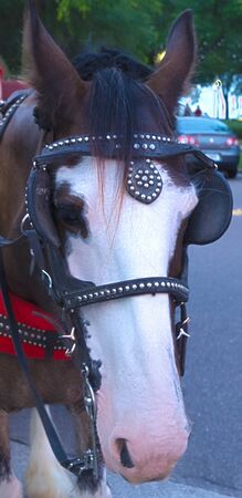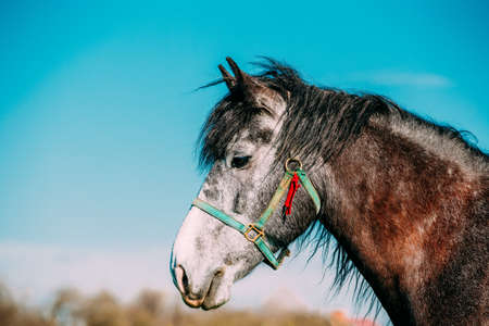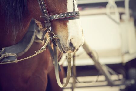 Muzzle of an Old Horse in Harness on a Sunny Day. Close Up