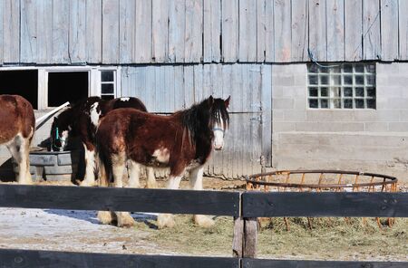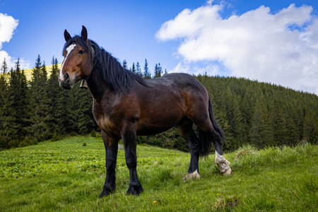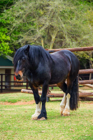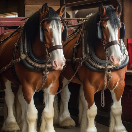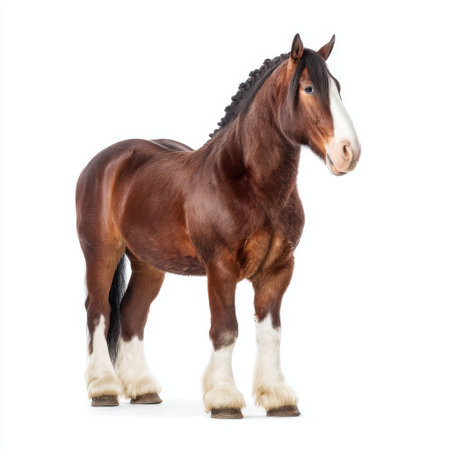 A magnificent Clydesdale horse stands proud, showcasing its strong build and beautiful coat. This image captures the animal's grace and charm perfectly.