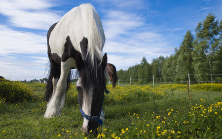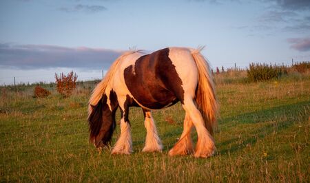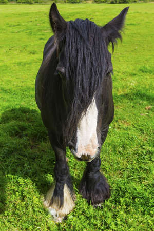 Black Gypsy horse aka Gypsy Vanner grazes on pasture. Summer rural landscape with Irish Cob in meadow under cloudy sky.
