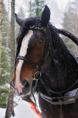 Horse head breed Brabancon with roan and bay color in a harness on the background of wooden fortress walls