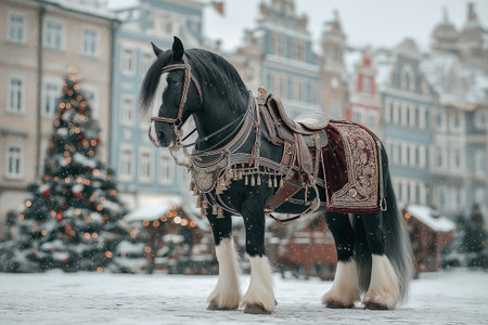 Stunning black horse with intricate saddle and bridle stands in a snowy plaza, surrounded by festive decorations and beautiful buildings, showing winter beauty and grace