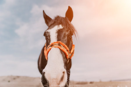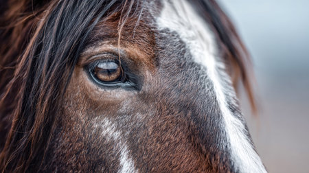 An intimate view capturing the horse's expressive eye and velvety coat, highlighting rich textures and soulful depth in a moment of quiet strength.