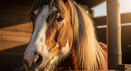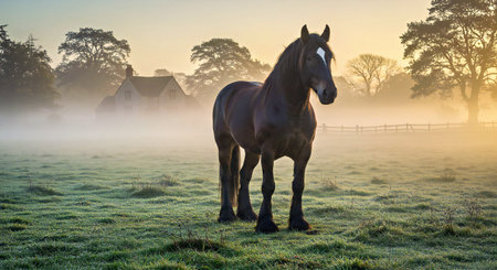 A majestic horse with a flowing mane stands on an English farm at sunset